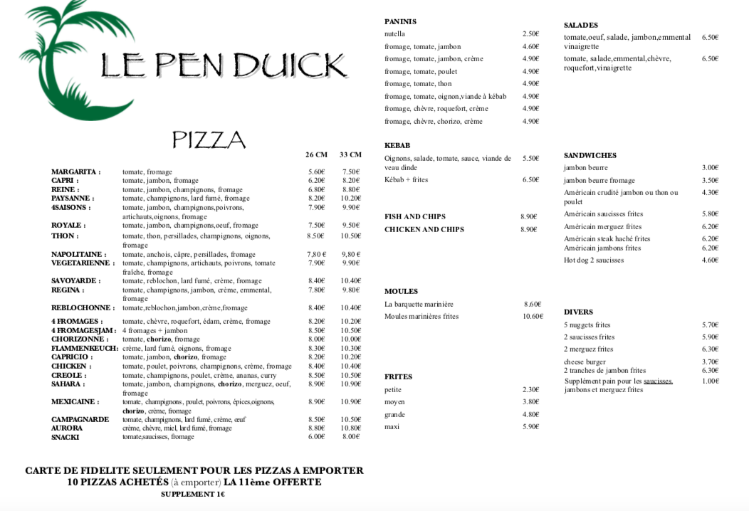 Welcome to Le Pen Duick Natacha, a hidden gem located in La Forêt-Fouesnant, where pizza lovers unite. This charming takeaway spot crafts delightful pizzas featuring a thin, crispy base, satisfying even the most discerning palates. Local reviews rave about the delicious, copious portions, with some entire pies overflowing from the box—truly a feast for the senses! But it's not just about the food; the inviting atmosphere, friendly staff, and genuine hospitality create a warm dining experience for families and friends alike.